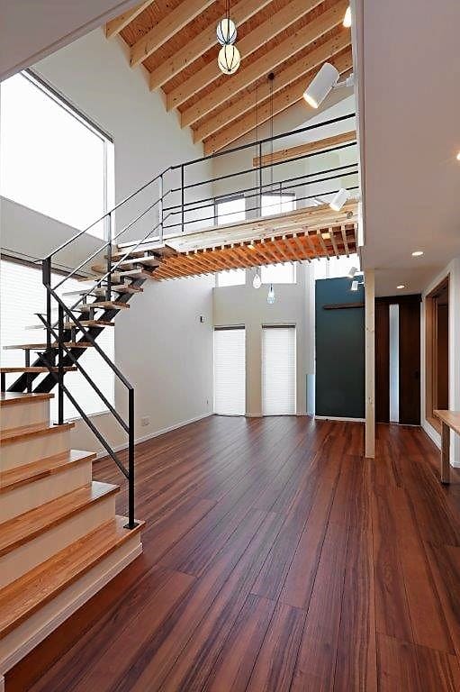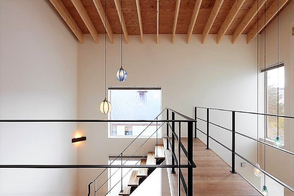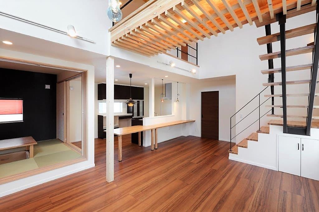 1階は玄関から吹き抜けで、さらにあらわし天井の開放的な空間です。屋根断熱にして、保温性も確保してあります。リビングルームと作り付けのカウンターと食卓があるキッチン、そしてご要望があって作った和室を、大きなワンルームのように配置しました。階段を上がった先の2階の廊下が吹抜けにかかるブリッジになっているのも、この家の大きな特徴です。