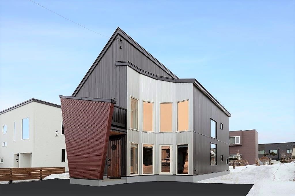 ご夫婦と幼稚園児、幼児の4人家族のご要望は、三角屋根。玄関ポーチの上に設置した物干しベランダの手すりを隠すために、斜めの切った壁面を玄関の前に。これは三角屋根と合わせて、マッターホルンのイメージでデザインしてみました。