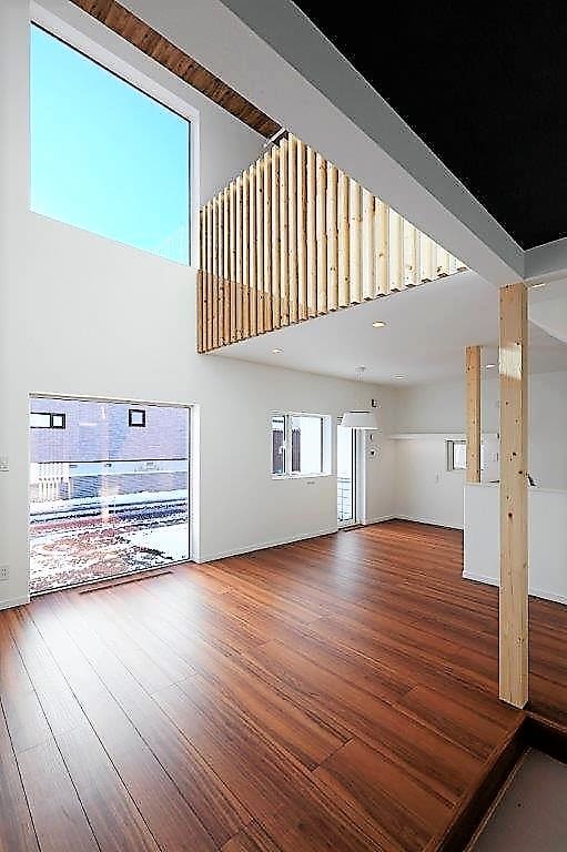 ご夫婦とまだ小さな子供が2人の4人家族です。あるゲームの中で頻繁に登場する、豆腐のような真っ白い長方形の家を実際に作ってみたい!というのが、ご主人のご要望。リビングルームを、大きな窓と吹き抜けで、気持ち良い空間に仕上げてみました。